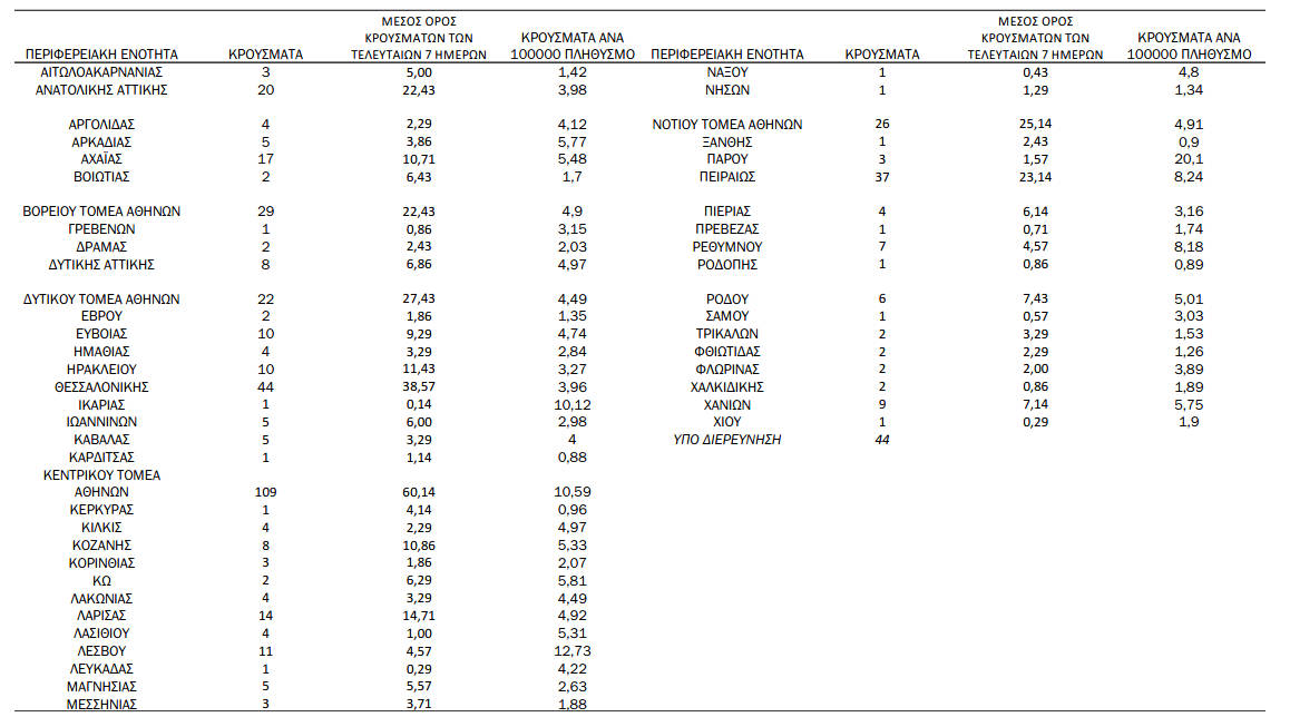 Με βάση τα επιβεβαιωμένα κρούσματα των τελευταίων 7 ημερών, 26 θεωρούνται σχετιζόμενα με ταξίδι από το εξωτερικό και 1.015 είναι σχετιζόμενα με ήδη γνωστό κρούσμα.
