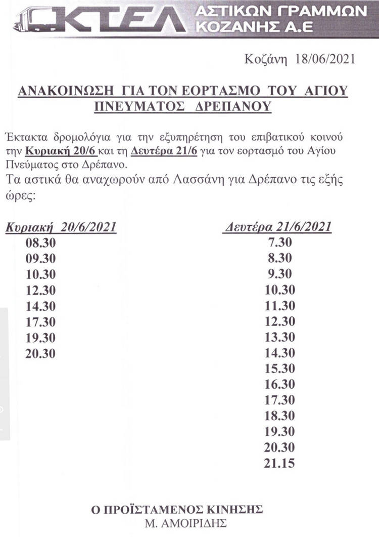 Κοζάνη 18/06/2021 Έκτακτα δρομολόγια των Αστικών λεωφορείων για τον εορτασμό του Αγίου Πνεύματος στο Δρέπανο 0 Έκτακτα δρομολόγια των Αστικών λεωφορείων για Δρέπανο για τον εορτασμό του Αγίου Πνεύματος. Δείτε τα δρομολόγια: