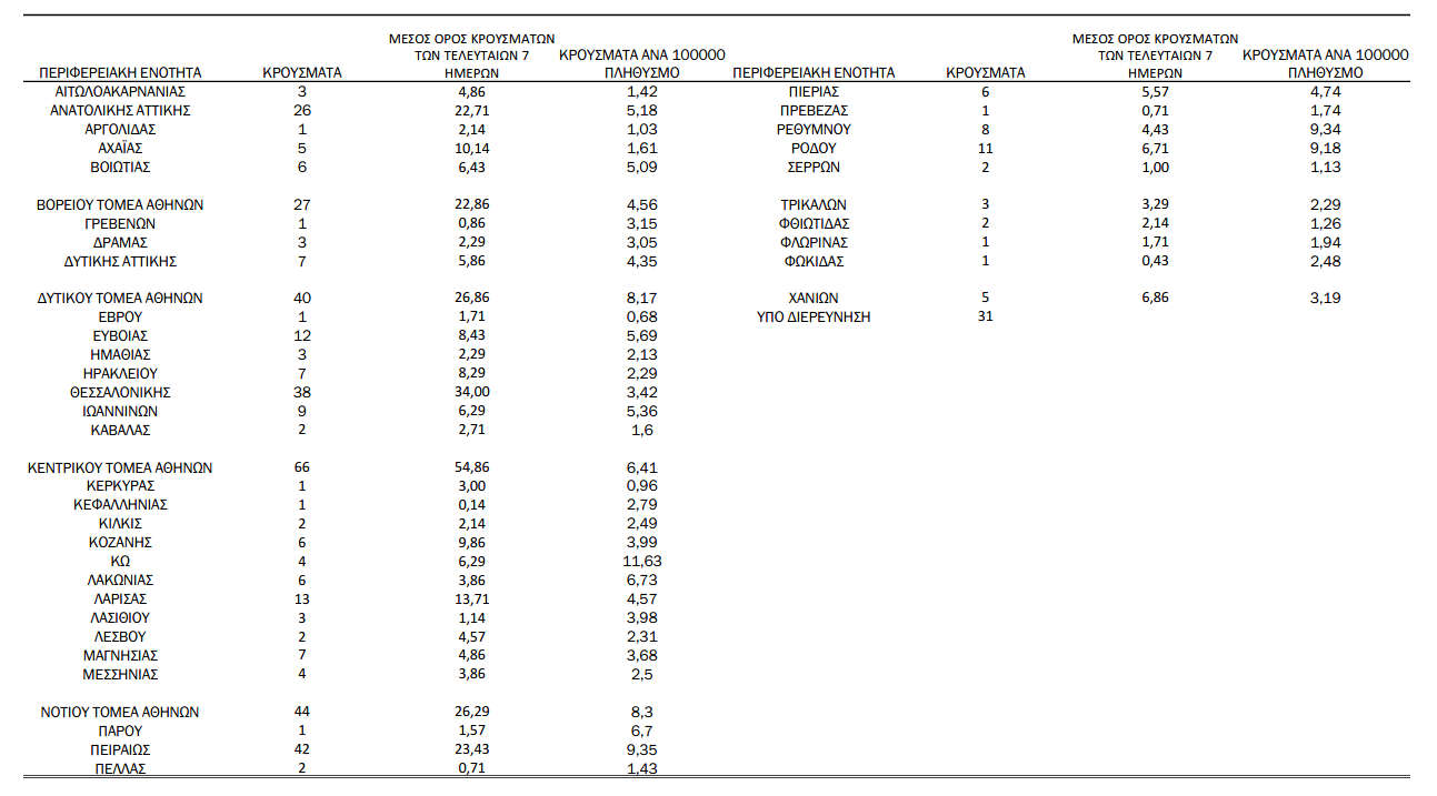 Με βάση τα επιβεβαιωμένα κρούσματα των τελευταίων 7 ημερών, 26 θεωρούνται σχετιζόμενα με ταξίδι από το εξωτερικό και 951 είναι σχετιζόμενα με ήδη γνωστό κρούσμα.