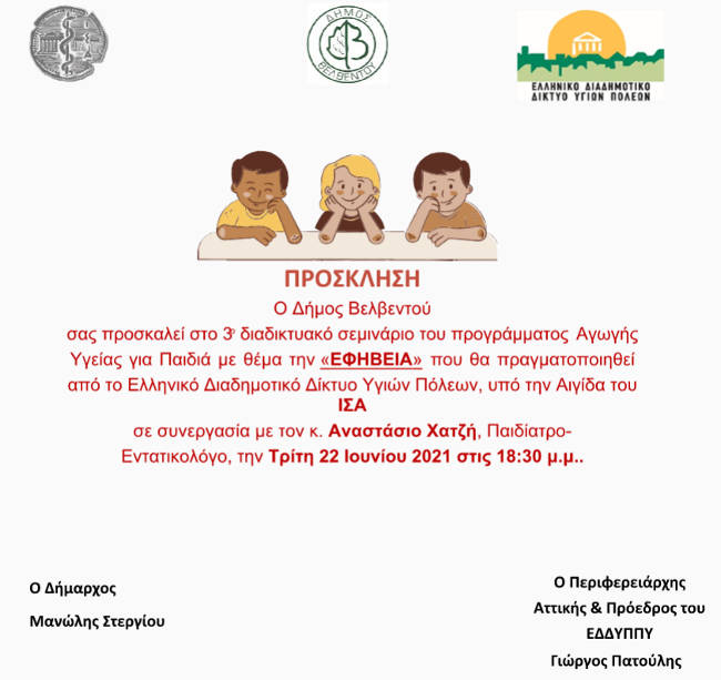 Το Ελληνικό Διαδημοτικό Δίκτυο Υγιών Πόλεων-Προαγωγής Υγείας (ΕΔΔΥΠΠΥ) σε συνεργασία με τον Δήμο Βελβεντού υπό την Αιγίδα του ΙΣΑ, ανακοινώνει την τελευταία ενότητα του διαδικτυακού προγράμματος «Αγωγή Υγείας για Παιδιά» την Τρίτη 22 Ιουνίου 2021 και ώρα 18:30μ.μ .