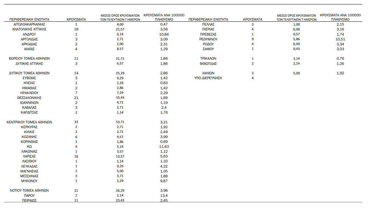Με βάση τα επιβεβαιωμένα κρούσματα των τελευταίων 7 ημερών, 31 θεωρούνται σχετιζόμενα με ταξίδι από το εξωτερικό και 900 είναι σχετιζόμενα με ήδη γνωστό κρούσμα.