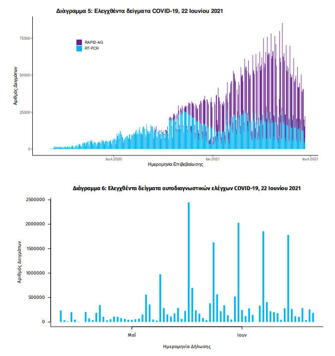 Ανακοινώθηκαν από τον ΕΟΔΥ σήμερα, Τρίτη 22 Ιουνίου 2021, 406 νέα κρούσματα κορονοϊού στη χώρα μας, εκ των οποίων κανένα δεν εντοπίστηκε σε ελέγχους στις πύλες εισόδου της χώρας.