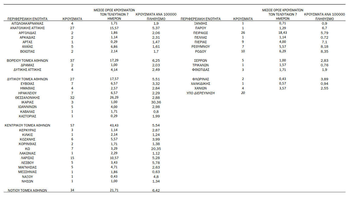 Ο συνολικός αριθμός των κρουσμάτων ανέρχεται σε 418.943 (ημερήσια μεταβολή +0.1%), εκ των οποίων 51.2% άνδρες. Με βάση τα επιβεβαιωμένα κρούσματα των τελευταίων 7 ημερών, 32 θεωρούνται σχετιζόμενα με ταξίδι από το εξωτερικό και 614 είναι σχετιζόμενα με ήδη γνωστό κρούσμα.