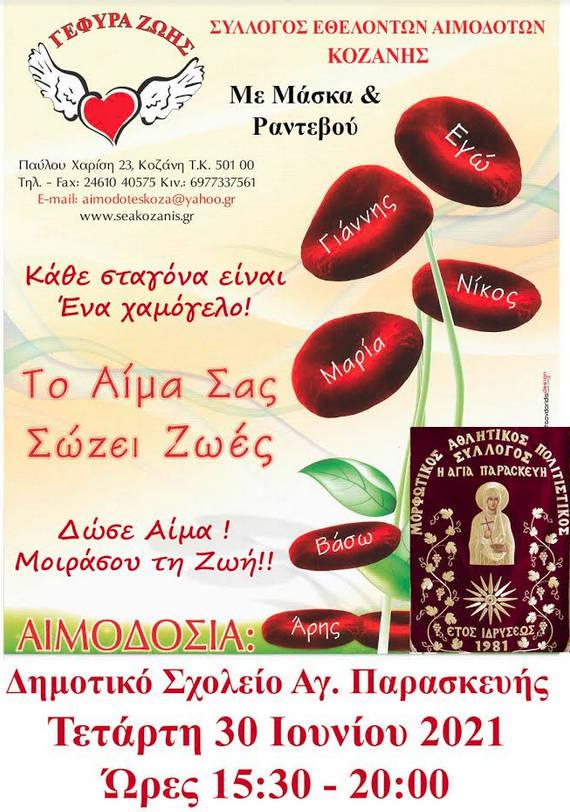 Την Τετάρτη 30 Ιουνίου 2021 και ΩΡΑ 15:30 -20:00 στο Δημοτικό Σχολείο του Δ.Δ Αγίας Παρασκευής, διοργανώνεται η 20η Αιμοδοσία του ΣΕΑ Κοζάνης με τον Πολιτιστικό Σύλλογο και το Τοπικό Συμβούλιο Αγίας Παρασκευής , σε συνεργασία με το τμήμα Αιμοδοσίας του Μαμάτσειου Γενικού Νοσοκομείου Κοζάνης.