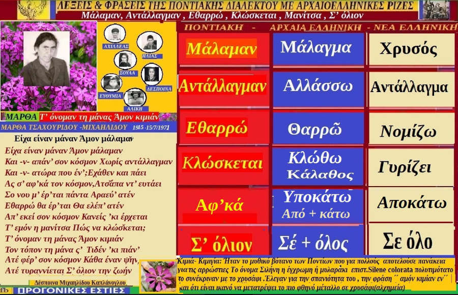 Η επιλογή των λέξεων της Ποντιακής διαλέκτου προέρχονται από στίχους του Ποντιακού τραγουδιού που αναφέρεται στην μάνα που έφυγε για το μεγάλο ταξίδι με τον τίτλο ΄΄ Είχα είναν μάναν Άμον μάλαμαν ΄΄.