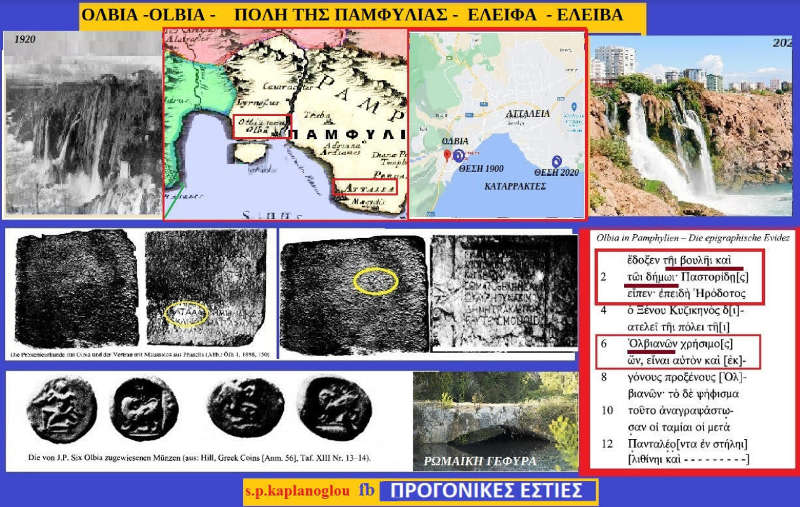 – Στο κολάζ φωτογραφιών κάνουμε χρήση και πάλι στο χάρτη του 1689 μ.Χ. που στηρίχθηκε στις συντεταγμένες του Πτολεμαίου και φαίνεται η παλιότερη ροή του ποταμού. Η σύγχρονη πόλη Αττάλεια, καταλαμβάνει όλο το παραλιακό μέτωπο δυτικά και ανατολικά των καταρρακτών του ποταμού Duden Su. (αρχαία Ελληνικά , ποταμός Καταρράκτες ¨που βρισκόταν ανατολικά της Όλβιας.