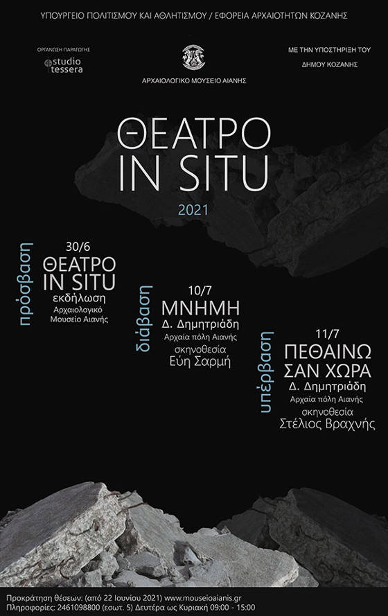 Εξαιτίας των καιρικών συνθηκών(βροχής) θα θέλαμε να ενημερώσουμε το κοινό ότι οι παραστάσεις του θεατρικού έργου «Πεθαίνω σαν χώρα» που θα γινόταν την Κυριακή 11 Ιουλίου 2021 και ώρα 20:00 και 21:30 αναβάλλονται για την Δευτέρα 12 Ιουλίου 2021 1η παράσταση 20:00 και η 2η παράσταση 21:30​