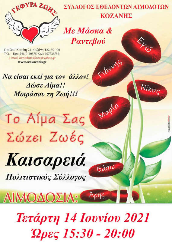 Την Τετάρτη 14 Ιουλίου 2021 και  ΩΡΑ 15:30-20:00 στην Αίθουσα του Πνευματικού Κέντρου του Δ.Δ της Καισαρειάς διοργανώνεται Αιμοδοσία του Σ.Ε.Α. Κοζάνης, σε συνεργασία με  τον Μορφωτικό- Πολιτιστικό Σύλλογο Καισαρειάς, Α.Ε. Καισαρειάς, Τοπική Κοινότητα Καισαρειάς και το τμήμα Αιμοδοσίας του Μαμάτσειου Γενικού Νοσοκομείου Κοζάνης.