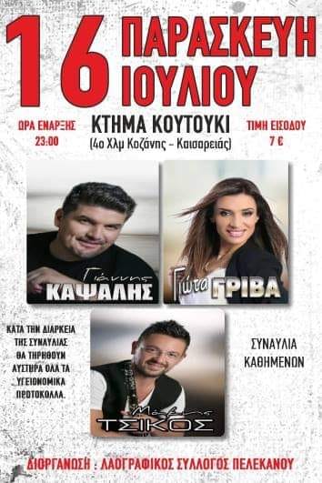 Ο Λαογραφικός Σύλλογος Πελεκάνου διοργανώνει συναυλία με τους Γιάννη Καψάλη, Γιώτα Γρίβα και Μάκη Τσίκο την Παρασκευή 16 Ιουλίου 2021 στο Κτήμα Κουτούκι (4ο χλμ. Κοζάνης – Καισαρειάς).