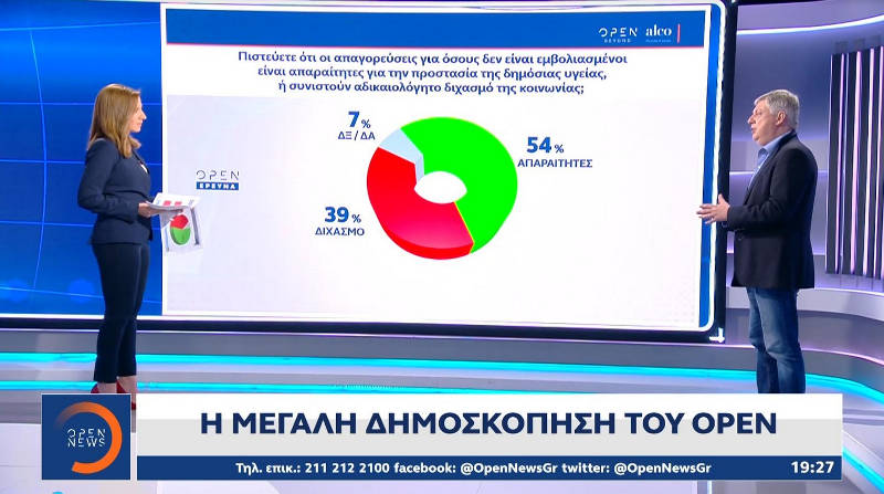 Το 54% θεωρεί ότι οι απαγορεύσεις για όσους δεν είναι εμβολιασμένοι είναι απαραίτητες για την προστασία της δημόσιας υγείας και το 39% ότι συνιστούν αδικαιολόγητο διχασμό της κοινωνίας, όπως έδειξαν τα ευρήματα της νέας μεγάλης δημοσκόπησης του κεντρικού δελτίου ειδήσεων του OPEN. Το 7% στην ίδια ερώτηση απάντησε «Δεν ξέρω/Δεν απαντώ».