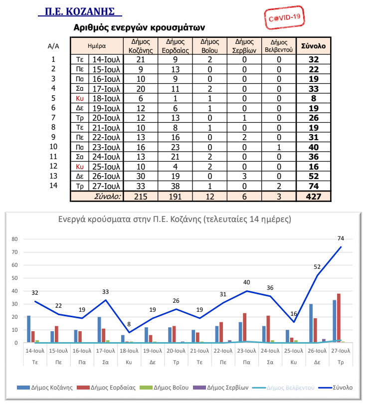 Η Περιφέρεια Δυτικής Μακεδονίας στα πλαίσια της ενημέρωσης για την εξέλιξη των κρουσμάτων κορωνοϊού, δίνει στη δημοσιότητα σχετικό πίνακα στον οποίο αποτυπώνεται ο αριθμός των ενεργών κρουσμάτων κατά Περιφερειακή Ενότητα.