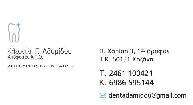 Κοζάνη 29/07/2021 Νέο οδοντιατρείο της Κλεονίκης Αδαμίδου στο Κέντρο της Κοζάνης 0 Κλεονίκη Γ. Αδαμίδου Απόφοιτος Α.Π.Θ. Χειρουργός Οδοντίατρος Π. Χαρίση 3, 1ος όροφος, Κοζάνη Τηλέφωνο: 2461100421 & 6986595144 email: dentadamidou@gmail.com Το οδοντιατρείο λειτουργεί καθημερινά κατόπιν ραντεβού.