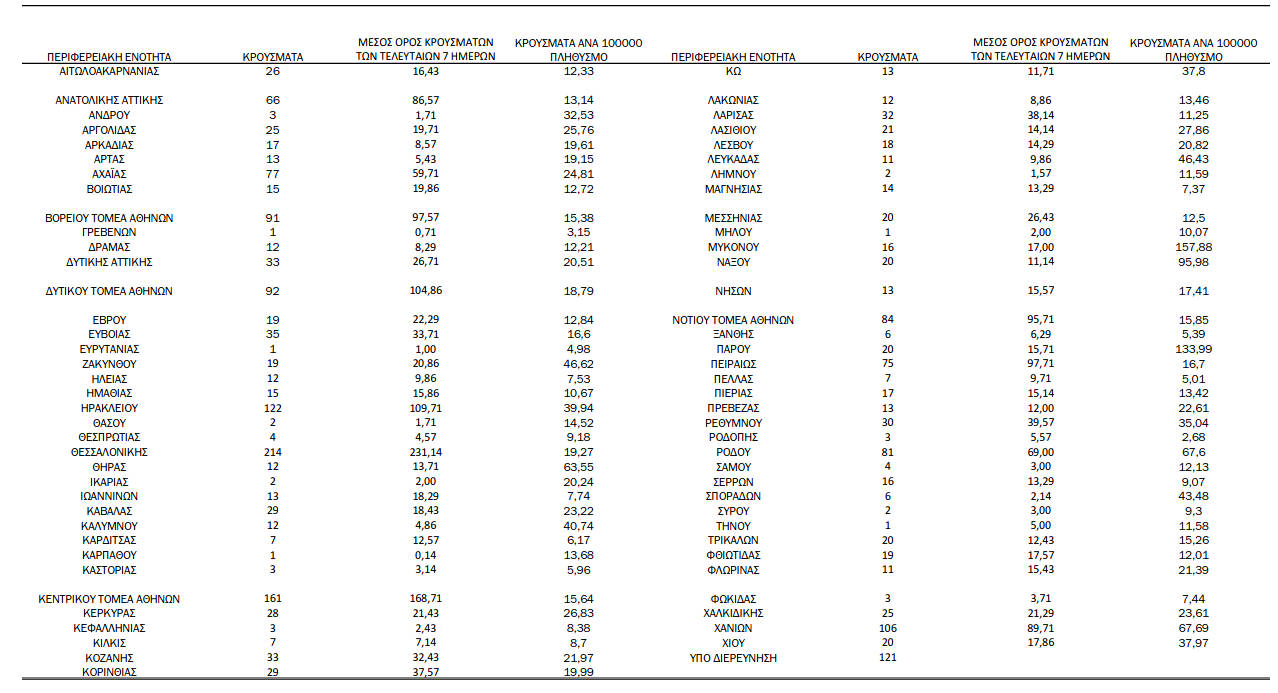 Ελλάδα, Κοζάνη 02/08/2021 Δείτε τα νέα κρούσματα κορονοϊού τη Δευτέρα 2/8 στη χώρα – Πόσα κρούσματα καταγράφονται στην Π.Ε. Κοζάνης 0 Ανακοινώθηκαν από τον ΕΟΔΥ σήμερα, 2 Αυγούστου 2021, 2.156 νέα κρούσματα κορονοϊού στη χώρα μας, 8 νέοι θάνατοι και 188 διασωληνωμένοι. Η γεωγραφική κατανομή των κρουσμάτων (κλικ στην εικόνα για μεγέθυνση):