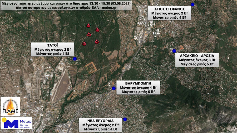 Δασική πυρκαγιά εκδηλώθηκε νωρίς το μεσημέρι (13:25) της Τρίτης 3 Αυγούστου 2021 στους πρόποδες της Πάρνηθας, στη Βαρυμπόμπη (Αττική). Κατά την ώρα εκδήλωσης της πυρκαγιάς (13:25) και κατά τη διάρκεια των πρώτων 2 ωρών εξάπλωσής της (13:30 – 15:30), στην ευρύτερη περιοχή έπνεαν άνεμοι με μέσες εντάσεις 2 – 4 Bf και ριπές στα 5 Bf, όπως προκύπτει από τις μετρήσεις των αυτόματων μετεωρολογικών σταθμών του δικτύου του Εθνικού Αστεροσκοπείου Αθηνών (ΕΑΑ) – meteo.gr .