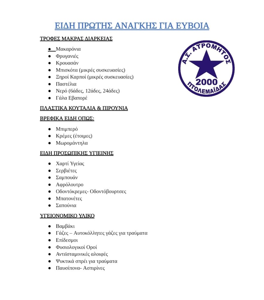 Θέλοντας να βοηθήσουμε έμπρακτα τους συνανθρώπους μας που περνάνε δύσκολες στιγμές, ως Ατρόμητος Πτολεμαΐδας αποφασίσαμε να μαζέψουμε είδη πρώτης ανάγκης που θα σταλούν στον Δήμο Μαντουδίου- Λίμνης- Αγίας Άννας στην Αγία Άννα Εύβοιας.