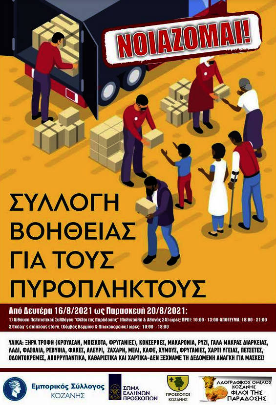 Ο Εμπορικός Σύλλογος Κοζάνης, οι Πρόσκοποι Κοζάνης και ο Λαογραφικός Όμιλος Κοζάνης «Φίλοι της Παράδοσης» συνεργάζονται και όλοι μαζί βάζουν το δικό τους λιθαράκι συλλέγοντας βοήθεια για τις πυρόπληκτες περιοχές, για τους ανθρώπους που βρέθηκαν μέσα σε λίγες ώρες χωρίς τίποτα!