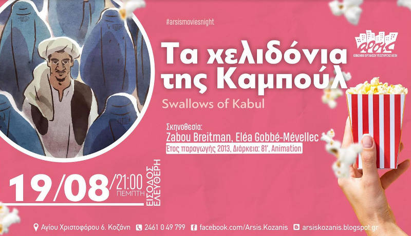 Αύριο, Πέμπτη 19 Αυγούστου, στις 21:00, στην αυλή του Σπιτιού της ΑΡΣΙΣ Κοζάνης, δείτε αυτά που συμβαίνουν και σήμερα στο Αφγανιστάν, μέσα από την κινηματογραφική οπτική των Ζαμπού Μπρετμάν και Ελιά Γκομπέ-Μεβελέκ, όπως αυτή αποτυπώθηκε στην ταινία animation: «Τα χελιδόνια της Καμπούλ».
