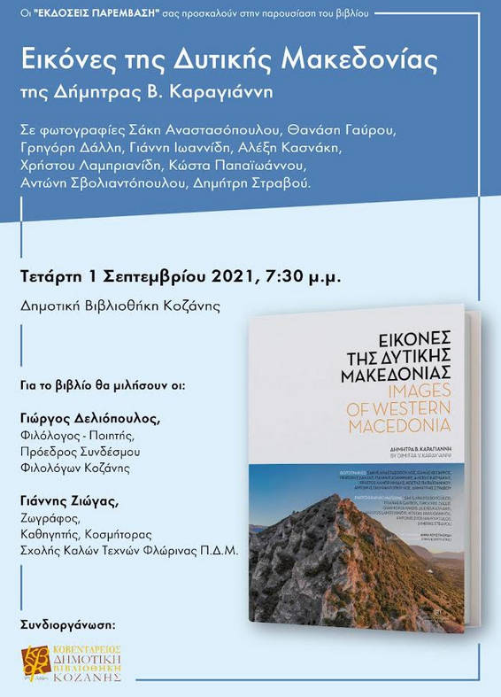 Οι “Εκδόσεις Παρέμβαση” σας προσκαλούν στην παρουσίαση του βιβλίου «Εικόνες της Δυτικής Μακεδονίας» της Δήμητρας Β. Καραγιάννη, σε φωτογραφίες Σάκη Αναστασόπουλου, Θανάση Γαύρου, Γρηγόρη Δάλλη, Γιάννη Ιωαννίδη, Αλέξη Κασνάκη, Χρήστου Λαμπριανίδη, Κώστα Παπαϊωάννου, Αντώνη Σβολιαντόπουλου, Δημήτρη Στραβού.