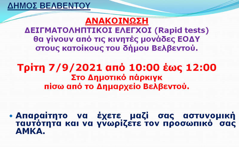 Σέρβια - Βελβεντό 05/09/2021 Νεα rapid tests την Τρίτη 7 Σεπτεμβρίου στο Δημαρχείο Βελβεντού 0 Νεα rapid tests την Τρίτη 7 Σεπτεμβρίου στο Δημαρχείο Βελβεντού: