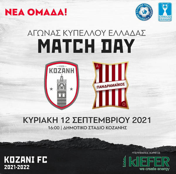 Με την ομάδα του Πανδραμαϊκου κληρώθηκε η ομάδα μας ΦΣ Κοζάνης για την δεύτερη φάση του Κυπέλλου Ελλάδας. Το παιχνίδι είναι νοκ άουτ και θα διεξαχθεί Κυριακή 12/9/2021, με ώρα έναρξης στις 16.00 στο ΔΑΚ Κοζάνης.