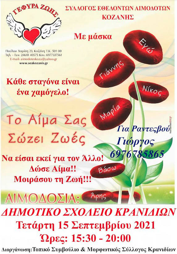 Αιμοδοσία την Τετάρτη 15 Σεπτεμβρίου 2021 και ΩΡΑ 15:00 -20:00 στο Δημοτικό Σχολείο του Τ.Δ Κρανιδίων, σε συνεργασία με το Τοπικό Συμβούλιο Κρανιδίων & την Αιμοδοσία του Γ.Ν. Κοζάνης.τηλ. για ραντεβού. Διαμαντής Γιώργος 6976785865