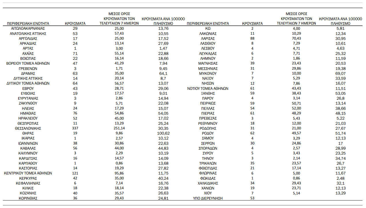 Ελλάδα, Κοζάνη 17/09/2021 Τα νέα κρούσματα κορονοϊού την Παρασκευή 17/9 στη χώρα – Πόσα κρούσματα καταγράφονται στην Π.Ε. Κοζάνης 1 Ανακοινώθηκαν από τον ΕΟΔΥ σήμερα, 17 Σεπτεμβρίου 2021, 2.255 νέα κρούσματα κορονοϊού στη χώρα μας, 39 νέοι θάνατοι και 352 διασωληνωμένοι. Η γεωγραφική κατανομή των κρουσμάτων (κλικ στην εικόνα για μεγέθυνση):