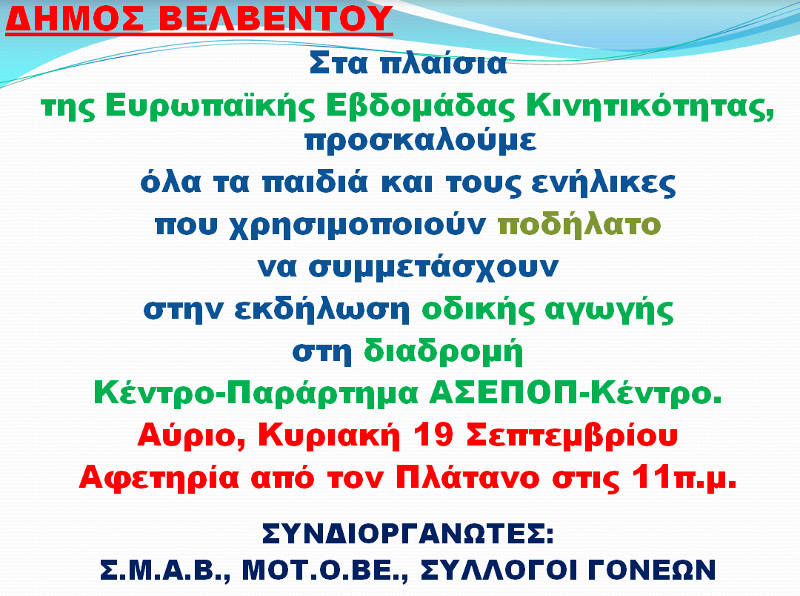 Στα πλαίσια της Ευρωπαϊκής Εβδομάδας Κινητικότητας, προσκαλούμε όλα τα παιδιά και τους ενήλικες που χρησιμοποιούν ποδήλατο να συμμετάσχουν στην εκδήλωση οδικής αγωγής στη διαδρομή Κέντρο-Παράρτημα ΑΣΕΠΟΠ-Κέντρο.