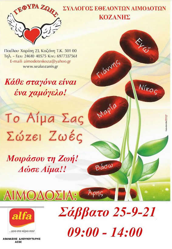 Αιμοδοσία το Σάββατο 25 Σεπτεμβρίου 2021 με τη διοίκηση και το προσωπικό της ALFA PASTRY – Αθανάσιος Δ. Κουκουτάρης ΑΕΒΕ, σε συνεργασία με τον Σύλλογο Εθελοντών Αιμοδοτών Κοζάνης ¨Γέφυρα Ζωής¨, τη βοήθεια του Ιατρικού Συλλόγου Κοζάνης και της Αιμοδοσίας του Γ.Ν. ¨Μποδοσάκειο¨ από τις 09:00 – 14:00 στην έδρα της επιχείρησης.