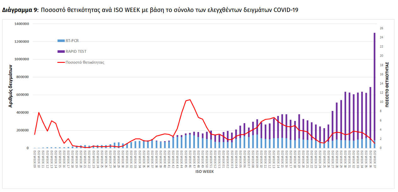 Την εβδομάδα αναφοράς, το ποσοστό θετικότητας ήταν 1.15%σε σύνολο 1.297.959 εργαστηριακών ελέγχων (RT-PCR/Rapid-Ag) και 0.28% σε σύνολο 1.771.780 αυτοδιαγνωστικών ελέγχων.