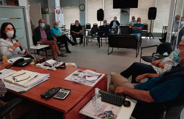 Αρχικά, επισκέφθηκε τα γραφεία των Συνταξιούχων της ΔΕΗ, όπου συναντήθηκε με το Δ.Σ. (Πρόεδρος: κ. Γ. Κάτανας, Αντιπρόεδρος: κ. Α. Ταχτσίδης, Γ.Γ.: κ. Θ. Τσιώτσιας, Ταμίας: κ. Γ. Παπαστέργιος, Αν. Γρ.: κ. Ν. Κοτρότσιος και Μέλη: κ. Ελ. Μαυροφυλίδου, κ. Ι. Χατζηιωάννου) και μέλη του Σωματείου.