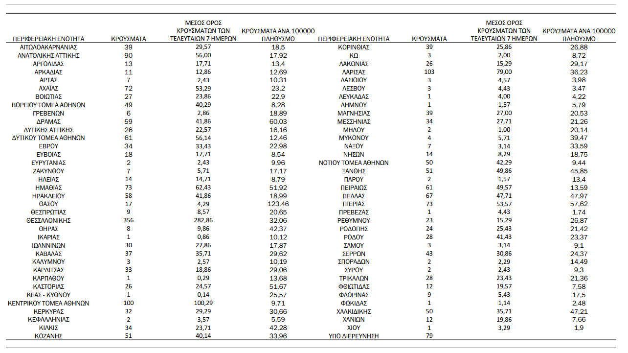 Ελλάδα, Κοζάνη 22/09/2021 Δείτε τα νέα κρούσματα κορονοϊού την Τετάρτη 22/9 στη χώρα – Πόσα κρούσματα καταγράφονται στην Π.Ε. Κοζάνης 0 Ανακοινώθηκαν από τον ΕΟΔΥ σήμερα, 22 Σεπτεμβρίου 2021, 2.329 νέα κρούσματα κορονοϊού στη χώρα μας, 26 νέοι θάνατοι και 333 διασωληνωμένοι. Η γεωγραφική κατανομή των κρουσμάτων (κλικ στην εικόνα για μεγέθυνση):