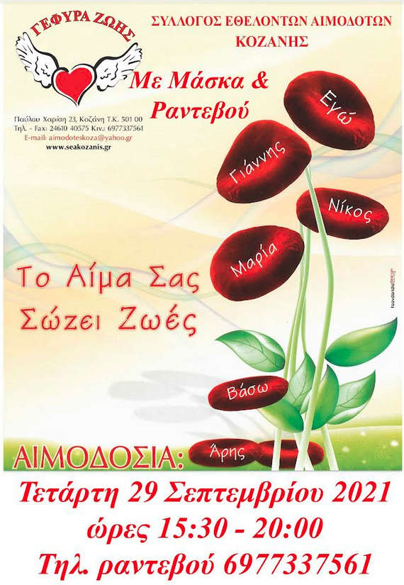 * (Ανακοινώσεις, Πρόγραμμα των επόμενων Αιμοδοσιών – Ενημέρωση για δωρεά Αιμοπεταλίων, Μυελού των Οστών, Ιστών και Οργάνων αλλά και Ομφαλοπλακουντιακού Αίματος (Βλαστοκυττάρων), στα γραφεία του συλλόγου μας Παύλου Χαρίση 23, Φαξ-τηλ.:2461040575 κινητό: 6977337561, στην ηλεκτρονική μας διεύθυνση, www.seakozanis.gr και στο facebook: Σύλλογος Εθελοντών Αιμοδοτών Κοζάνης)