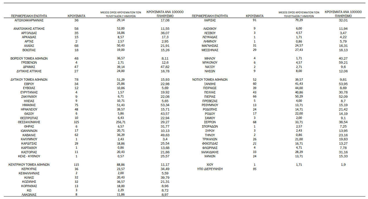 Ελλάδα, Κοζάνη 27/09/2021 Τα νέα κρούσματα κορονοϊού τη Δευτέρα 27/9 στη χώρα – Πόσα κρούσματα καταγράφονται στην Π.Ε. Κοζάνης 0 Ανακοινώθηκαν από τον ΕΟΔΥ σήμερα, 27 Σεπτεμβρίου 2021, 2.130 νέα κρούσματα κορονοϊού στη χώρα μας, 47 νέοι θάνατοι και 323 διασωληνωμένοι. Η γεωγραφική κατανομή των κρουσμάτων (κλικ στην εικόνα για μεγέθυνση):