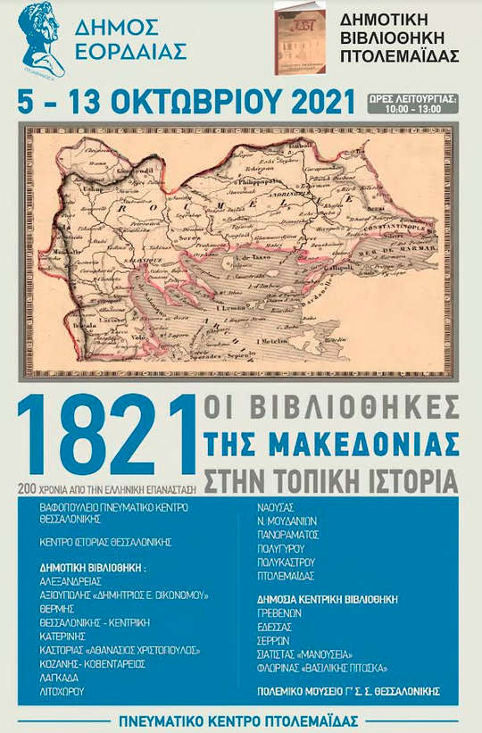 Οι βιβλιοθήκες της Μακεδονίας ενώνουν τις δυνάμεις τους, με πρωτοβουλία του Δήμου Θεσσαλονίκης, για να τιμήσουν την επέτειο των 200 χρόνων από την έναρξη της Ελληνικής Επανάστασης μέσα από μια διαδημοτική έκθεση τεκμηρίων, η οποία φιλοξενείται στον Δήμο Εορδαίας από τις 5 έως τις 13 Οκτωβρίου 2021, στο χώρο του Πνευματικού Κέντρου Πτολεμαΐδας.