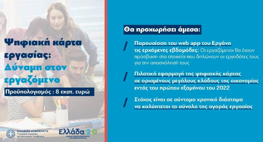 Το πρωτοποριακό εργαλείο της ψηφιακής κάρτας εργασίας περιλαμβάνεται μεταξύ των δράσεων του υπουργείου Εργασίας και Κοινωνικών Ασφαλίσεων για την αξιοποίηση των πόρων ύψους 2,6 δισ. ευρώ που έχουν δεσμευθεί από το σχέδιο του Ταμείου Ανάκαμψης.