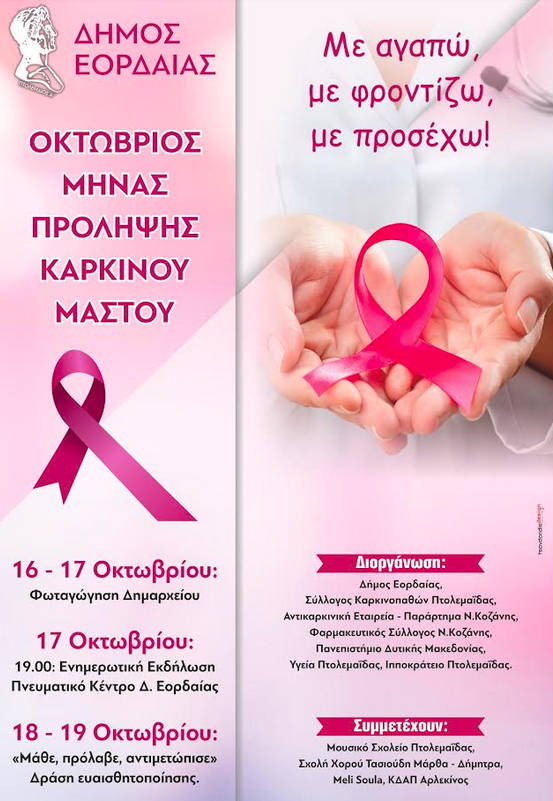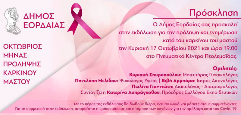 Πτολεμαΐδα 14/10/2021 Δράσεις του Δήμου Εορδαίας για την πρόληψη και ενημέρωση κατά του καρκίνου του μαστού 0 Δράσεις του Δήμου Εορδαίας για την πρόληψη και ενημέρωση κατά του καρκίνου του μαστού: