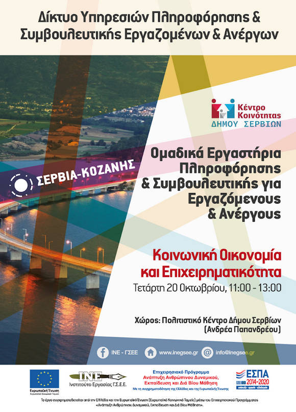 Το Περιφερειακό ΙΝ.Ε.-Γ.Σ.Ε.Ε. Δυτικής Μακεδονίας (Κοζάνη), ανακοινώνει την υλοποίηση ομαδικού εργαστηρίου πληροφόρησης για ανέργους και εργαζομένους, με θέμα: «Κοινωνική Οικονομία και Επιχειρηματικότητα».