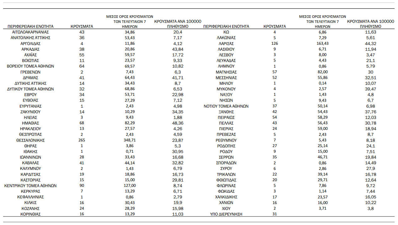 Ελλάδα, Κοζάνη 17/10/2021 Τα νέα κρούσματα κορονοϊού την Κυριακή 17/10 – Πόσα κρούσματα καταγράφονται στην Π.Ε. Κοζάνης 0 Ανακοινώθηκαν από τον ΕΟΔΥ σήμερα, 17 Οκτωβρίου 2021, 1.712 νέα κρούσματα κορονοϊού στη χώρα μας, 27 νέοι θάνατοι και 357 διασωληνωμένοι. Η γεωγραφική κατανομή των κρουσμάτων (κλικ στην εικόνα για μεγέθυνση):