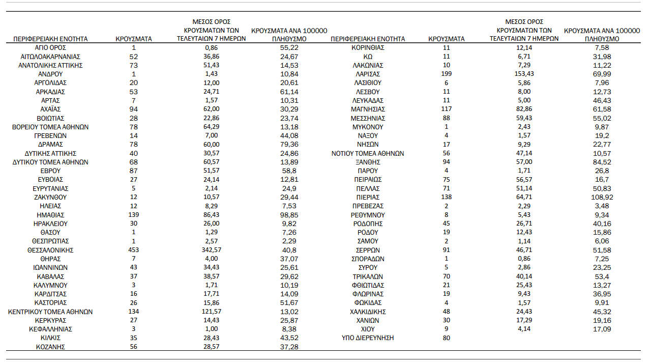 Ελλάδα, Κοζάνη 18/10/2021 Δείτε τα νέα κρούσματα κορονοϊού τη Δευτέρα 18/10 στη χώρα – Πόσα καταγράφονται στην Π.Ε. Κοζάνης 1 Ανακοινώθηκαν από τον ΕΟΔΥ σήμερα, 18 Οκτωβρίου 2021, 3.164 νέα κρούσματα κορονοϊού στη χώρα μας, 43 νέοι θάνατοι και 347 διασωληνωμένοι. Η γεωγραφική κατανομή των κρουσμάτων (κλικ στην εικόνα για μεγέθυνση):