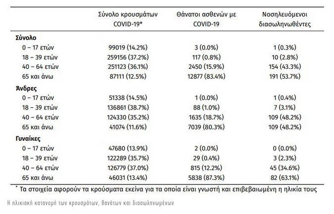 Στον πίνακα ηλικιακής κατανομής του ΕΟΔΥ, ο οποίος καταγράφει τον αριθμό των επιβεβαιωμένων κρουσμάτων κορωνοϊού, τους θανάτους και τους διασωληνωμένους ανά ηλικιακή ομάδα, είναι εμφανές πως ο Covid απειλεί άμεσα τους μεγαλύτερους σε ηλικία.
