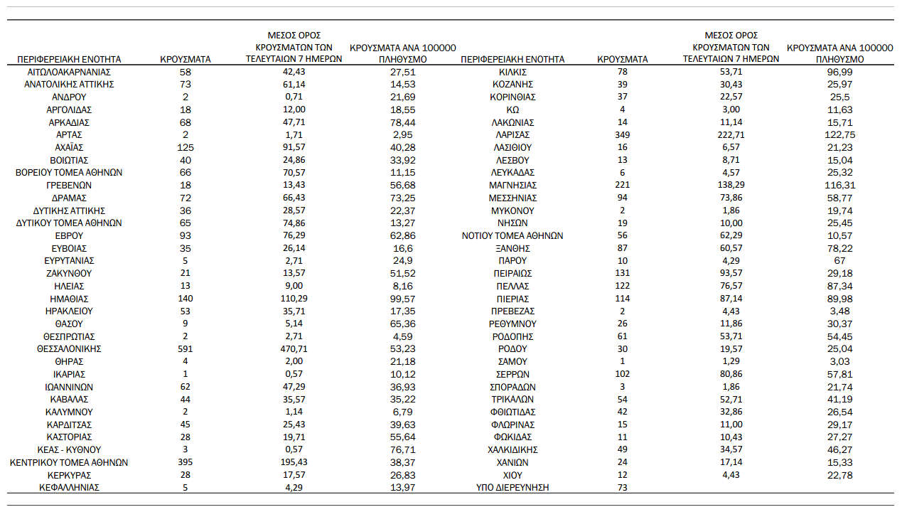 Ελλάδα, Κοζάνη 26/10/2021 Ξεπέρασαν τα 4.100 τα κρούσματα κορονοϊού την Τρίτη 26/10 στη χώρα – Τα κρούσματα στην Π.Ε. Κοζάνης – Η γεωγραφική κατανομή 0 Ανακοινώθηκαν από τον ΕΟΔΥ σήμερα, 26 Οκτωβρίου 2021, 4.165 νέα κρούσματα κορονοϊού στη χώρα μας, 25 νέοι θάνατοι και 380 διασωληνωμένοι. Η γεωγραφική κατανομή των κρουσμάτων (κλικ στην εικόνα για μεγέθυνση): Δείγματα που έχουν ελεγχθεί: