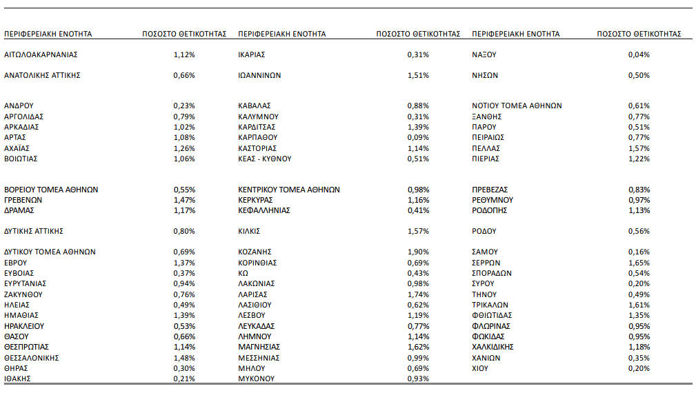 Δείτε στον παραπάνω πίνακα το ποσοστό θετικότητας στο σύνολο των ελέγχων ανά Περιφερειακή Ενότητα με δεδομένα από 08 Νοεμβρίου 2021 έως 14 Νοεμβρίου 2021.
