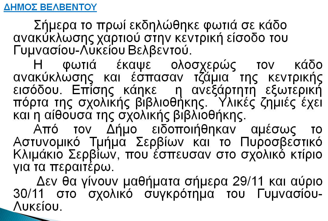Κλειστό το γυμνάσιο – λύκειο του Βελβεντού για 2 μέρες λόγω της φωτιάς που εκδηλώθηκε το πρωί.
