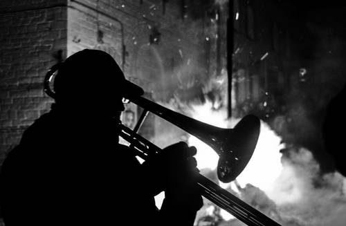 Φλεγόμενη τρομπέτα στο χορό γύρω από την κλαδαριά στην Πλατεία Αγοράς στη Σιάτιστα