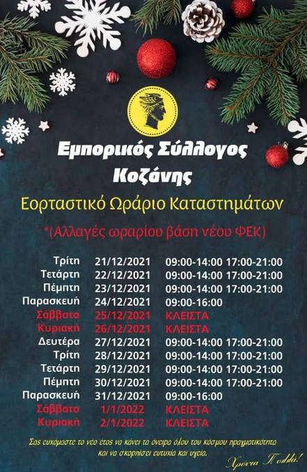 Μετά από πιέσεις και συζητήσεις του Εμπορικού Συλλόγου Κοζάνης με την ΕΣΕΕ και από τη σειρά της με τα αρμόδια υπουργεία έγινε δεκτό το αίτημά μας για εξαίρεση της έναρξης του ωραρίου των εμπορικών καταστημάτων της πόλης μας στις 10:00. Έτσι από αύριο Τρίτη 21-12-2021 το πρωϊνό ωράριο των καταστημάτων επεκτείνεται κατά μία ώρα ανοίγοντας και πάλι στις 09:00.