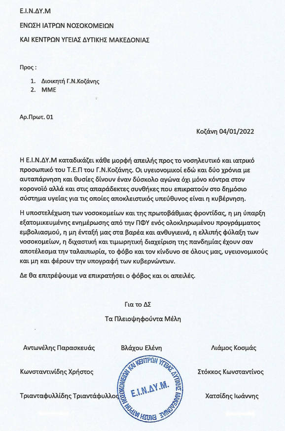 Κοζάνη 04/01/2022 ΕΙΝΔΥΜ: «Καταδικάζουμε κάθε μορφή απειλής προς το νοσηλευτικό και ιατρικό προσωπικό του ΤΕΠ του Νοσοκομείου Κοζάνης» 0 ΕΙΝΔΥΜ: «Καταδικάζουμε κάθε μορφή απειλής προς το νοσηλευτικό και ιατρικό προσωπικό του ΤΕΠ του Νοσοκομείου Κοζάνης»