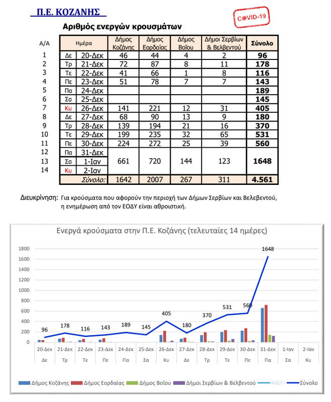 Η Περιφέρεια Δυτικής Μακεδονίας στο πλαίσιο της ενημέρωσης για την εξέλιξη των κρουσμάτων κορωνοϊού, δίνει στη δημοσιότητα σχετικό πίνακα στον οποίο αποτυπώνεται ο αριθμός των ενεργών κρουσμάτων κατά Περιφερειακή Ενότητα.
