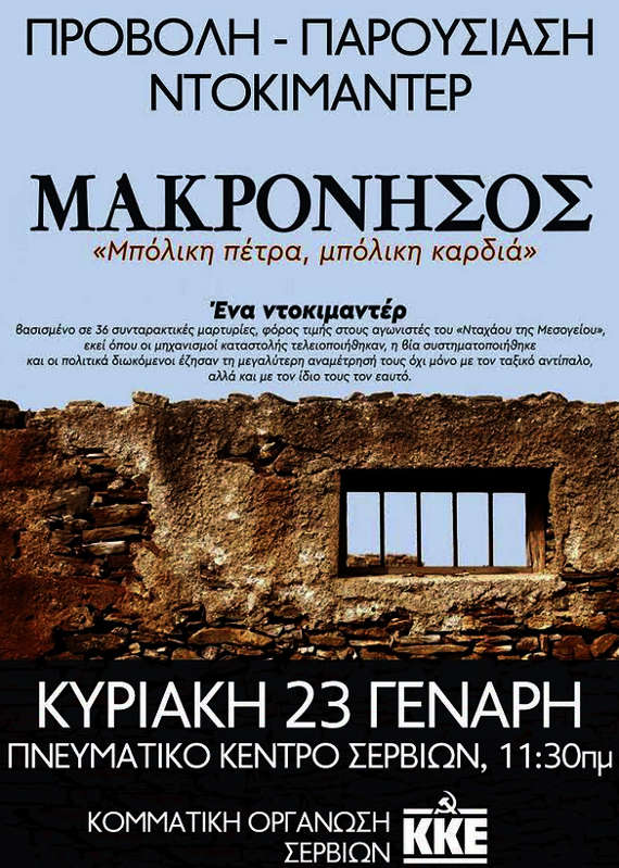 Η Κομματική Οργάνωση Σερβίων του ΚΚΕ οργανώνει την Κυριακή 23 Ιανουαρίου προβολή- Παρουσίαση του ντοκιμαντέρ ΜΑΚΡΟΝΗΣΟΣ « μπόλικη πέτρα, μπόλικη καρδιά»