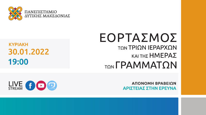 Σας προσκαλούμε στον Εορτασμό των Τριών Ιεραρχών και της Ημέρας των Γραμμάτων που θα πραγματοποιηθεί διαδικτυακά την Κυριακή 30 Ιανουαρίου 2022 και ώρα 19:00.