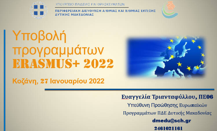Την Πέμπτη 27 Ιανουαρίου 2022 η Περιφερειακή Διεύθυνση Εκπαίδευσης Δυτικής Μακεδονίας πραγματοποίησε διαδικτυακή ενημερωτική συνάντηση με θέμα «Υποβολή προγραμμάτων Erasmus+ 2022». Στην τηλεσυνάντηση συμμετείχαν εκπρόσωποι από σχολικές μονάδες Α/θμιας και Β/θμιας Εκπαίδευσης Δυτικής Μακεδονίας και από υποστηρικτικές δομές εκπαίδευσης. Το θέμα της ενημέρωσης παρουσίασε η υπεύθυνη προώθησης των Ευρωπαϊκών Προγραμμάτων της Π.Δ.Ε. Δυτικής Μακεδονίας, κα Ευαγγελία Τριανταφύλλου.